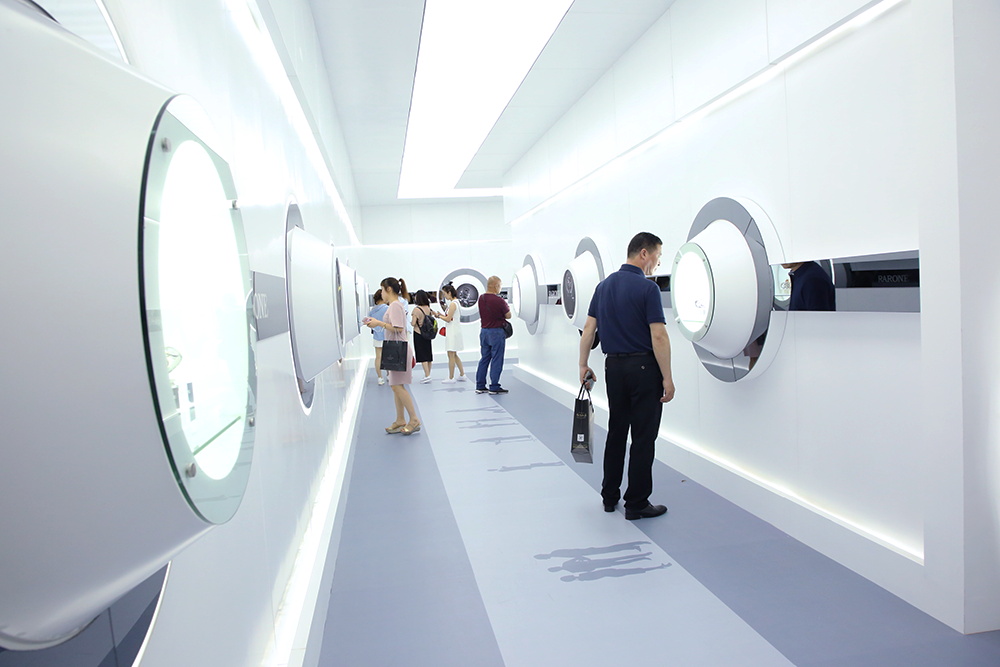 今年的雷諾表展館展臺以波浪形的表帶及表盤合成抽象的圓形表盤,并配以燈光,極具視覺沖擊力,白色的線條猶如鋼琴的琴鍵,流暢而優(yōu)美,環(huán)繞展臺四周,時間與優(yōu)雅的生活完美融合,并在入口處設(shè)置時光隧道,光影穿梭,引領(lǐng)全新的商務(wù)體驗(yàn)和潮流。展館內(nèi)的流水幕墻,寓意著時光的流動完美融合其中,展示效果更為生動。