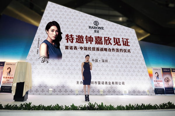 當天,鐘嘉欣現(xiàn)身雷諾“古典話筒”展館,引爆現(xiàn)場高潮氣氛,成為整個展覽的焦點,秒殺不少菲林。下午5時,鐘嘉欣佩戴雷諾贈送的手表,與雷諾表業(yè)董事長詹西洲、總經(jīng)理詹江洲、《中國經(jīng)營報》社長韓曦晨共同揭開“藝術(shù)之旅”系列新表款的神秘面紗,正式對外發(fā)布這一全新系列的新表款。